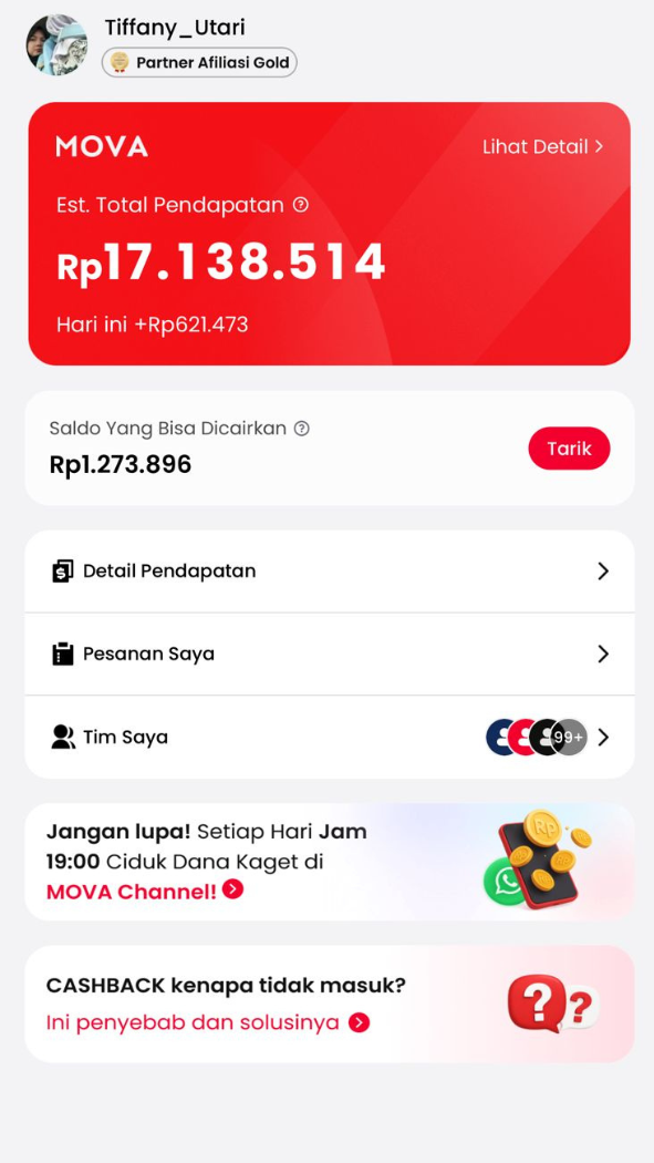 Cashback instan tiap belanja di Shopee, Tiktok, Lazada, Tiket.com, & Traveloka. Gabung MOVA Team, raih komisi pasif seumur hidup!