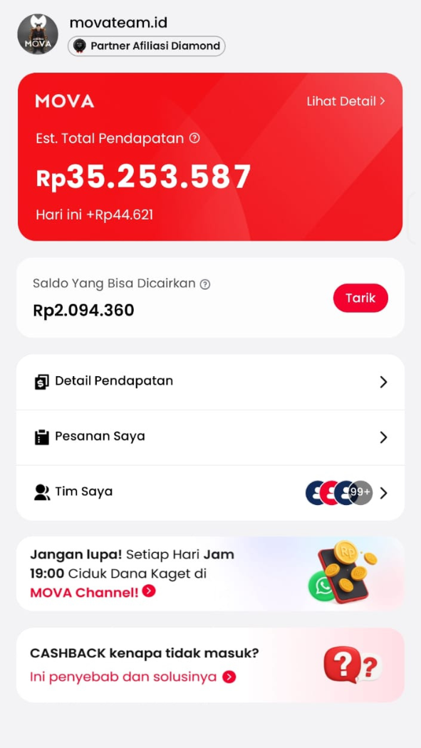 Cashback instan tiap belanja di Shopee, Tiktok, Lazada, Tiket.com, & Traveloka. Gabung MOVA Team, raih komisi pasif seumur hidup!